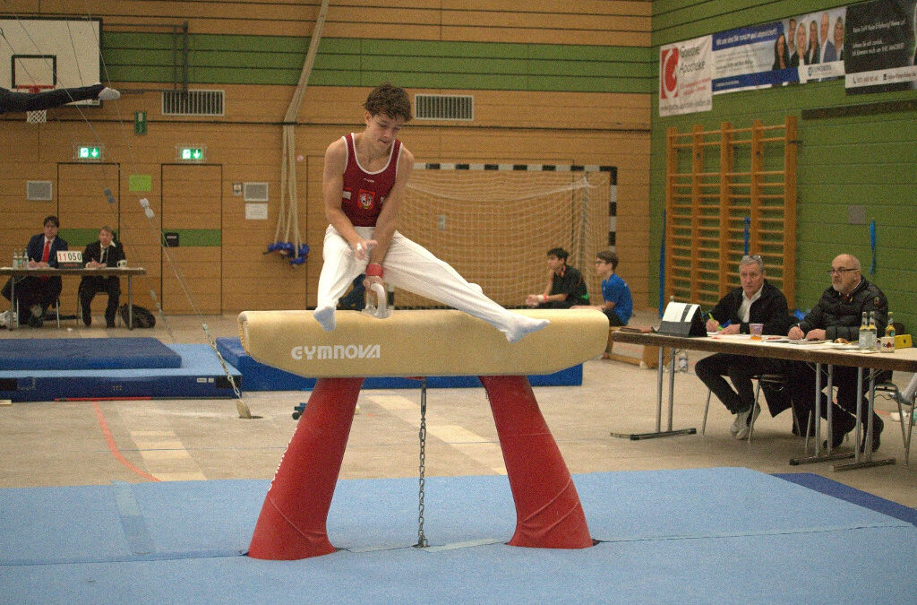 Die Turner der 1. Mannschaft des TV Eschborn starteten unglücklich in den Wettkampf. An den ersten beiden Geräten (Barren und Reck) patzten je zwei Turner. Nachdem der Boden mit stabilen Übungen gut verlief, folgten mit Pauschenpferd und Ringen erneut Geräte, an denen mindestens zwei Turner je Gerät verturnten. Am letzten Gerät zeigten die Eschborner Turner dann einfache aber sehr gut ausgeführte Sprünge. Die Freude war groß, als man bei der Siegerehrung feststellte, dass man den Wettkampf trotzdem vor der KTV Obere Lahn mit einem Vorsprung von 1,45 Punkten gewonnen hatte. Trainer Niklas Roth führt das darauf zurück, dass die Eschborner in der Breite sehr stark aufgestellt sind und verturnte Übungen besser ausgleichen können als die anderen Mannschaften. So war man selbst überrascht, dass man neben dem Boden auch am Barren und Reck die beste Mannschaft des Tages war. Besonders gelungen waren die Übungen von Julius Wiegand am Boden (13,75 Pkt.) und an den Ringen (11,95 Pkt.) sowie von Silas Drosin am Barren (11,95 Pkt.). Nach zwei gewonnen Wettkämpfen führt der TV Eschborn die Tabelle mit 24:00 vor der KTV Obere Lahn mit 20:04 an.